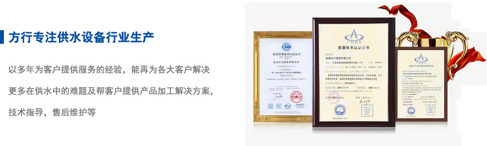 鹽城方行集團有限公司創建于一九七七年,四十多年來,在各級領導、國家行業協會和大專院校的大力支持幫助下,現已發展成為一家集研發、設計、生產、銷售、安裝、服務于一體的給排水設備企業。產品優良,注重品牌。本公司先后榮獲“明星企業”、“中國鄉鎮明星企業”、“中國馳名品牌”等榮譽稱號?!胺叫小迸撇Aт搳A砂管道、水箱被江蘇省建設廳指定為推廣產品;污水處理設備被專家評定為國家級新產品;方行牌玻璃鋼夾砂管道、玻璃鋼貯罐、一體化預制泵站、生活、消防箱泵一體化、污水處理設備、玻璃鋼水箱、不銹鋼水箱等產品先后被評為鹽城市名牌產品,江蘇省優質產品,江蘇省名牌產品。公司技術和售后服務日臻完善。在同行中享有很高的知名度、美譽度。以信為本,廣拓業務。本公司始終恪守“持之以恒、誠信為本”的經營宗旨,持續發揚自強不息,順勢而上,趨利避弊,不斷推動產品發展,為我國的給排水工業,為我們的民族工業品牌的發展而做出自己的貢獻。堅持革新,與時俱進。公司一貫跟隨社會的發展堅持不斷革新、嚴謹規劃、精益求精的質量方針。公司著重于環保新技術及給排水設備的創新研發,已擁有多項國家專利技術。